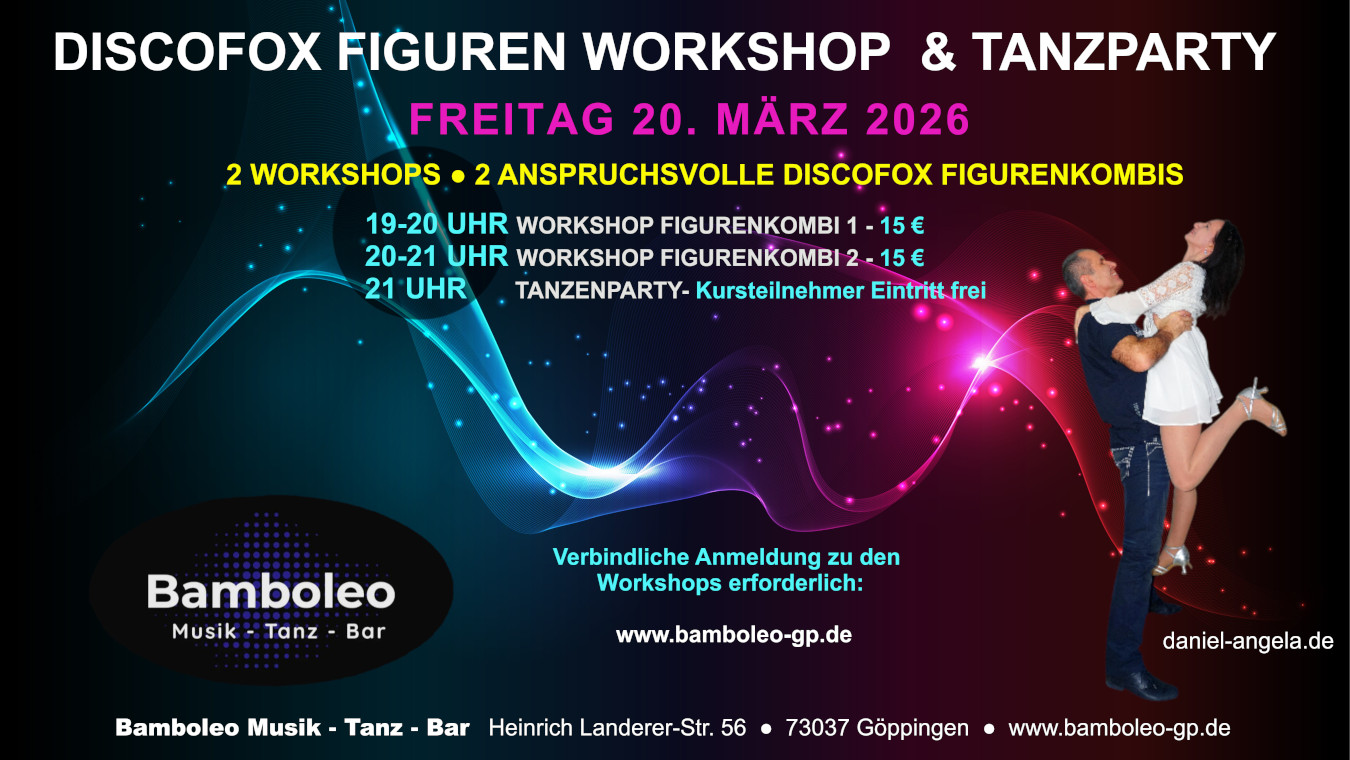 Discofox Figuren Workshop & Tanzparty im Bamboleo in Göppingen Erlebt mit uns einen mitreißenden Abend voller Tanz, Kreativität und Spaß im Bamboleo in Göppingen. Unser Discofox Figuren Workshop bietet euch spannende Figurenkombis und coole Moves, die ihr direkt in der anschließenden Tanzpartys umsetzen könnt. Mit unseren fantasievollen Figurenkombis, die bereits Millionen Mal auf Social Media angeschaut wurden, konnten wir bereits weltweit hunderte Paare begeistern und inspirieren. Kommt zu unserem Workshop und überzeugt euch selbst. Ihr werdet es lieben :) Ihr könnt euch jetzt schon auf ein vielfältiges Programm freuen, der von einem anfängerfreundlichen Einstieg bis hin zu den komplexen Figurenkombis alles beinhaltet. Wir freuen uns auf euch :) Daniel & Angela |