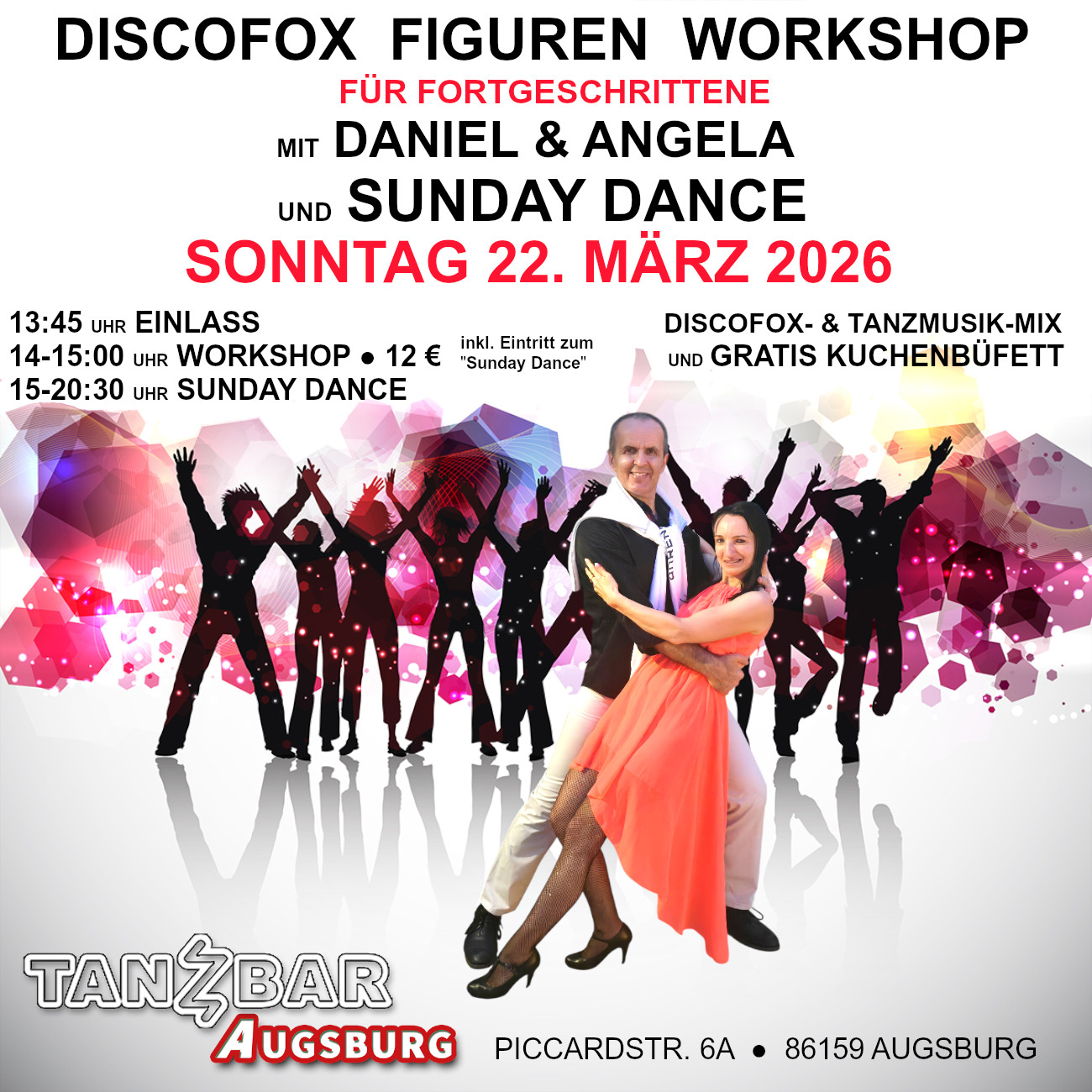 Es ist für uns eine große Freude, unseren DISCOFOX FIGUREN WORKSHOP für FORTGESCHRITTENE in dieser wunderschönen Tanzlocation zu unterrichten. Ihr könnt euch jetzt schon auf eine anspruchsvolle Choreo aus unserem Programm freuen, bei der der Blickfang auf der Tanzfläche bestimmt garantiert ist. Im Anschluss daran findet der SUNDAY DANCE statt, mit dem besten Discofox- und Tanz Musik-Mix, bei dem wir gemeinsam mit euch, das Tanzbein schwingen lassen werden. Mit dem leckeren GRATIS KUCHENBÜFETT dazu, wird der Sonntag perfekt sein :) Gemeinsam mit dem Team von der Tanzbar in Augsburg freuen wir uns auf euch ! Ihr werdet begeistert sein :) |