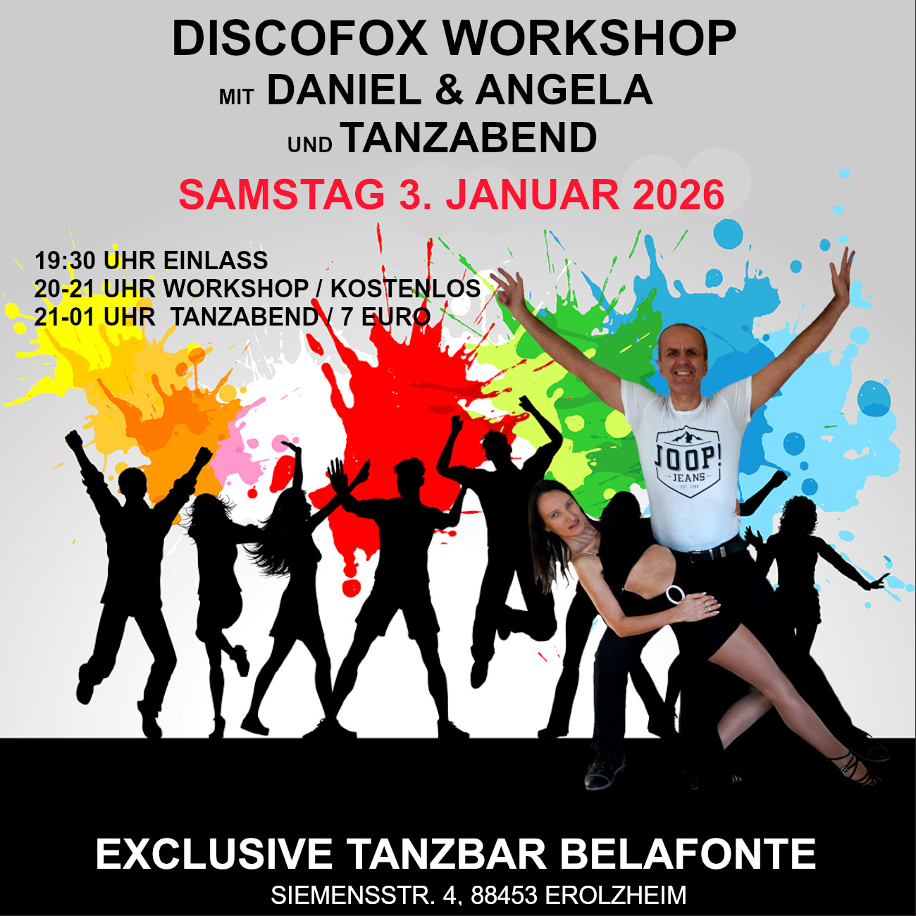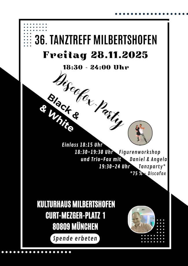 DISCOFOX- und TRIO FOX-WORKSHOPS mit anschließerden Tanzpartys im Kulturhaus Milbertshofen in München Aus unseren fantasievollen Choreos, haben wir auch dieses mal schöne Figurenkombis herausgesucht die wir euch gerne, in unseren Discofox- und Trio Fox-Workshops, Schritt für Schritt erklären möchten. Nach den Workshops finden die jeweiligen Tanzpabende unter dem Motto Black & White Party und Christmas Partys vom Veranstalter und DJ Manfred statt. Getanzt wird Discofox 75%, Boogie, Walzer, Rumba, Cha Cha, Salsa, Tango, Freestyle. Ihr könnt euch jetzt schon darauf freuen :) |