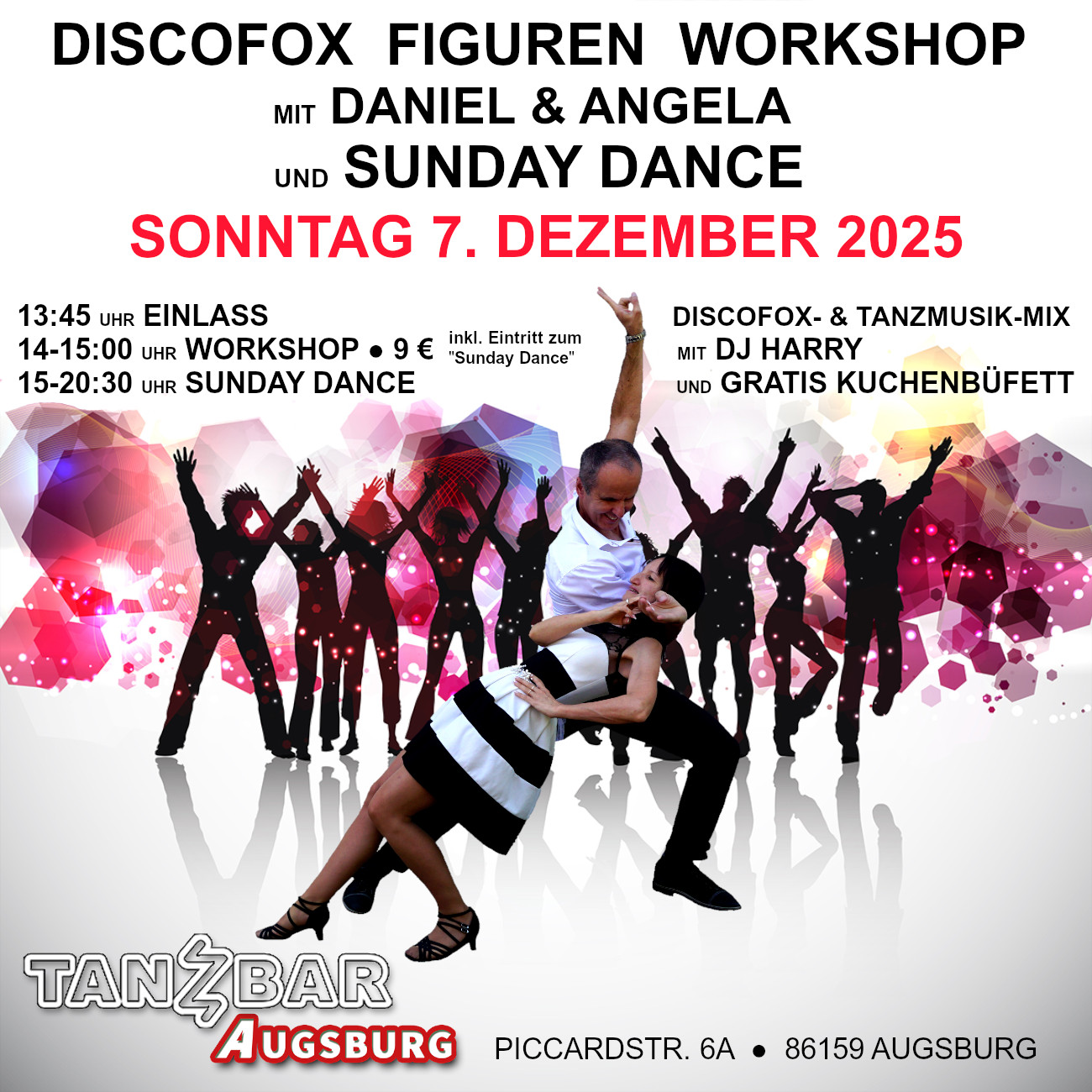 Es ist für uns eine große Freude, unseren DISCOFOX FIGUREN WORKSHOP in dieser wunderschönen Tanzlocation zu unterrichten. Ihr könnt euch jetzt schon auf eine fantasievolle Choreo aus unserem Programm freuen, bei der der Blickfang auf der Tanzfläche bestimmt garantiert ist. Im Anschluss daran findet der SUNDAY DANCE statt, mit dem besten Discofox- und Tanz Musik-Mix vom DJ Harry, bei dem wir gemeinsam mit euch, das Tanzbein schwingen lassen werden. Mit dem leckeren GRATIS KUCHENBÜFETT dazu, wird der Sonntag perfekt sein :) Gemeinsam mit dem Team von der Tanzbar in Augsburg freuen wir uns auf euch ! Ihr werdet begeistert sein :) |